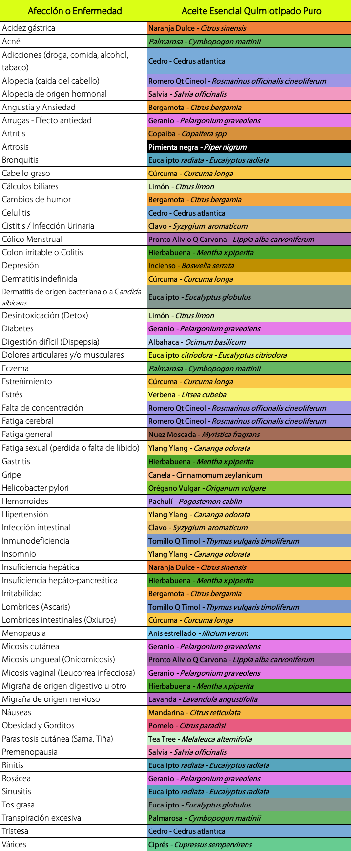 En la tabla a continuación, se presentan algunos ejemplos de usos tradicionales priorizados de Aceites Esenciales Quimiotipados Puros con Composición Molecular Garantizada, para 61 afecciones y enfermedades. Si desea conocer más acerca de su forma de uso correcto, el personal de la Farmacia Homeopática le puede colaborar.