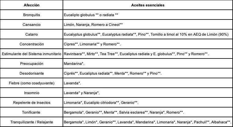 Adicionalmente, la tabla a continuación presenta una lista de AEQ organizados por afecciones. que se pueden usar en difusión con la especificación de tipo de uso (puro:* o diluido al 10%:**)